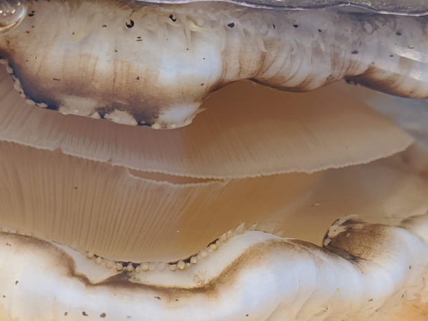 外套膜(ヒモ)の周囲にある黒い点々がホタテの目(眼点)です。