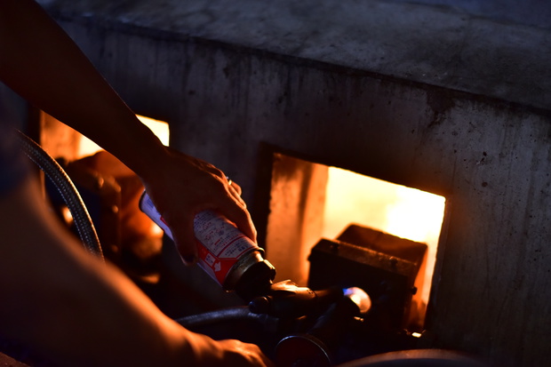 大きな釜に絞り汁を流し入れてから着火。