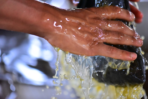 粘度のチェックをする厳しい眼差しの杉俣紘二朗氏