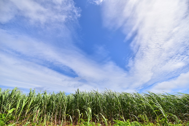 抜けた青空と広がるサトウキビ畑とゴマ畑。