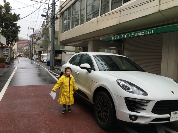 どなた様かのポルシェ前で撮影をせがむ長男。
