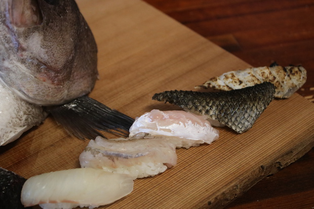 ヒラスズキをこんなに分厚く、贅沢に食べられるのも釣り人の特権です。