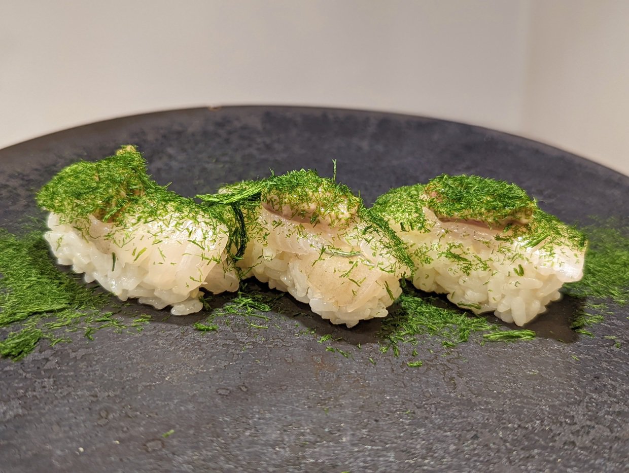 【ヒラメのエンガワ肝のせ握り寿司 すじあおのりを添えて】