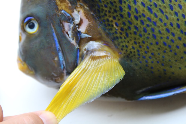 鰭(ひれ)や鰓(えら)が青い蛍光色で縁取られていてとても綺麗です。