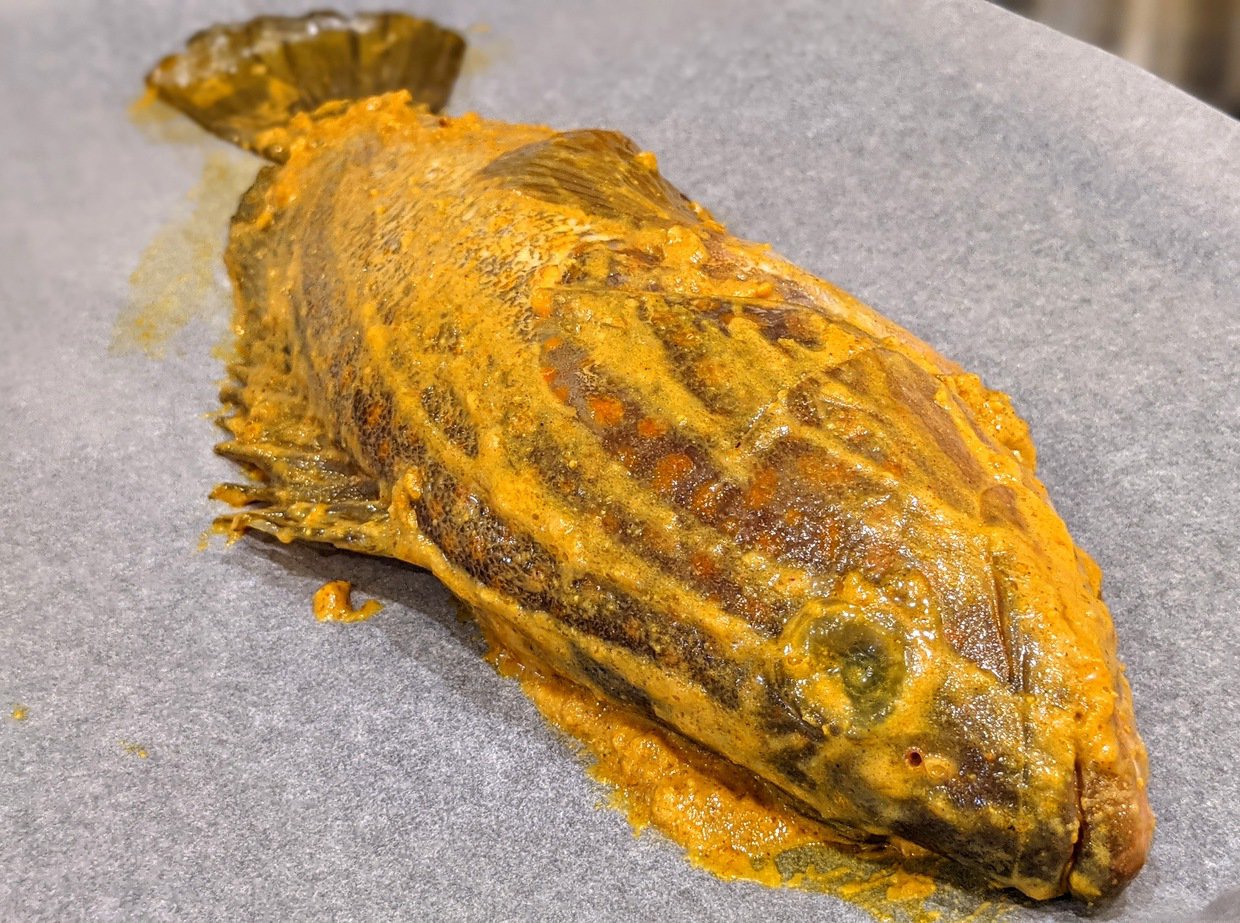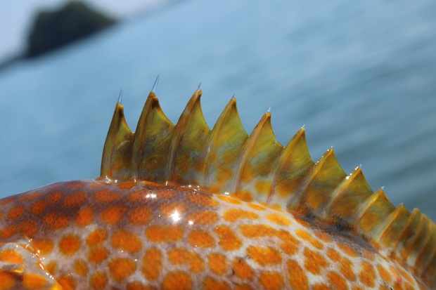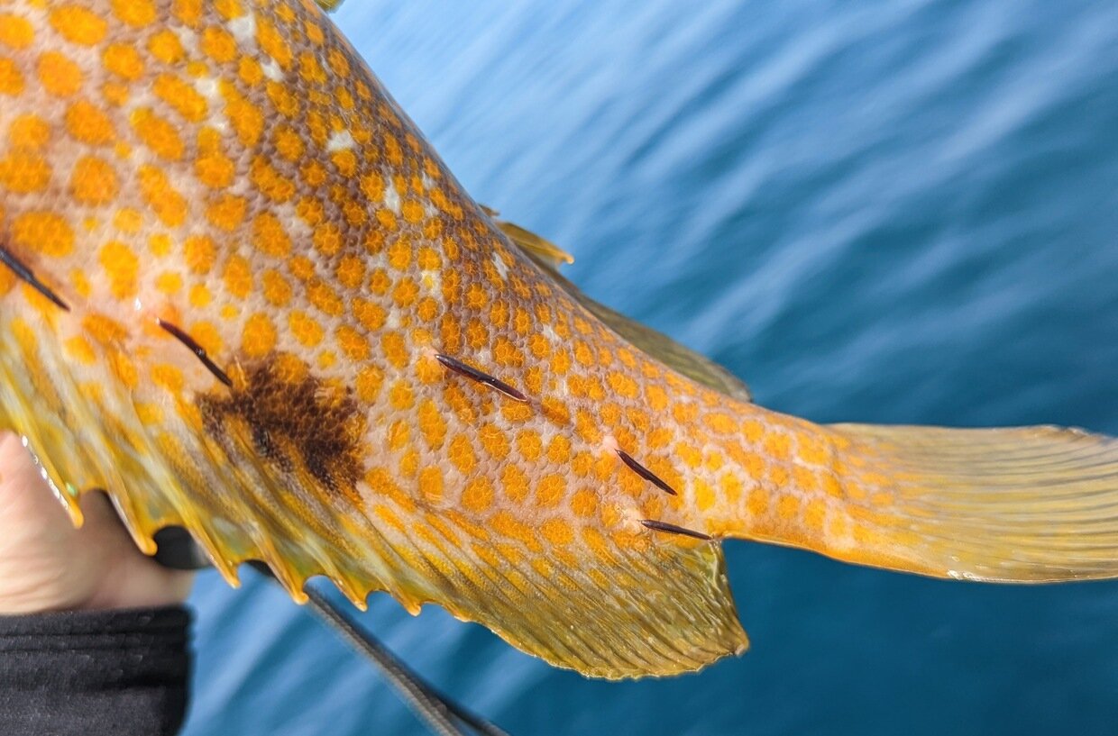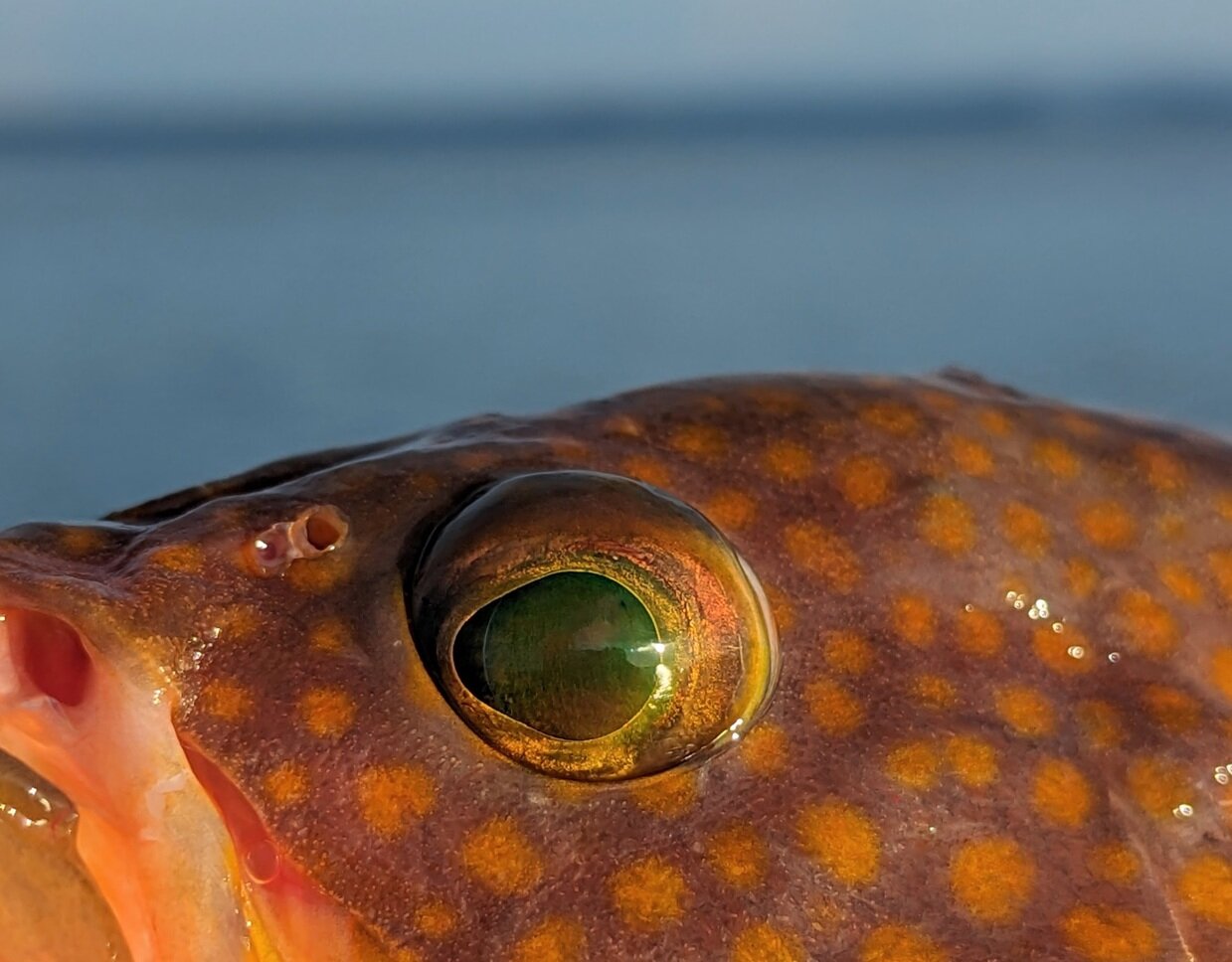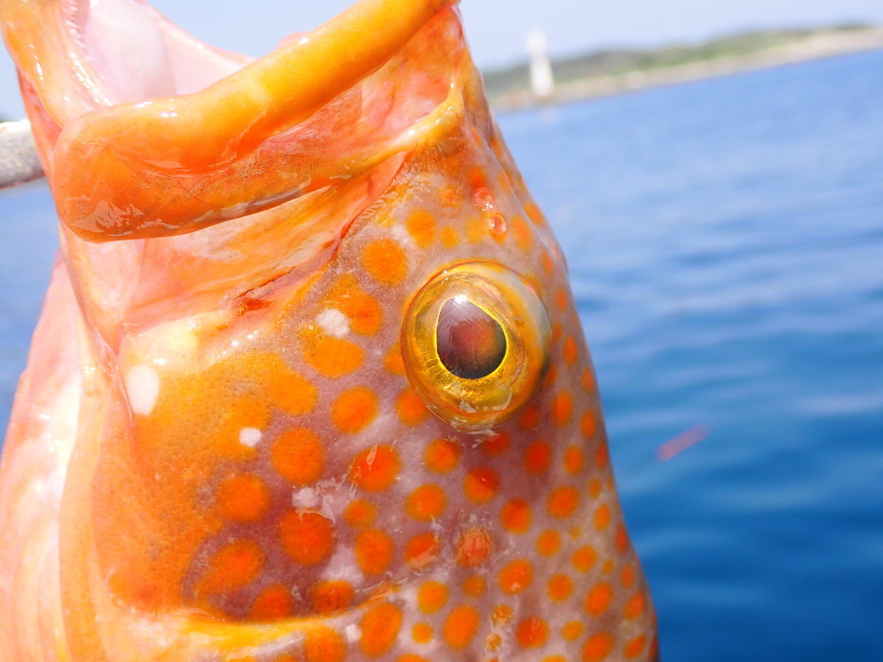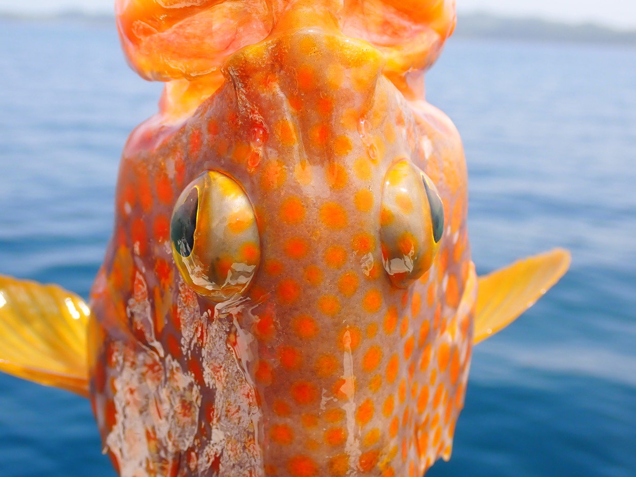 胴体だけでなく、顔やヒレにまで広がる無数のオレンジ色のサイズの異なるドットがオシャレなキジハタ。