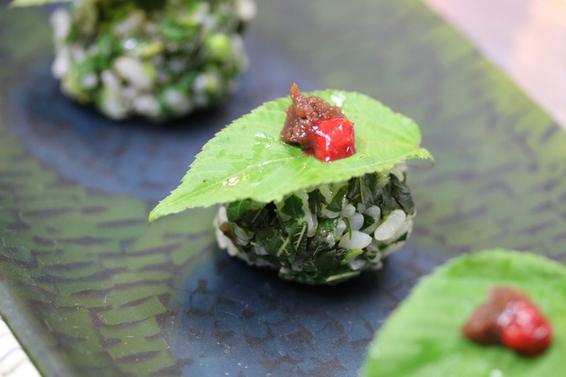 茹で、叩いたモロヘイヤと酢飯を混ぜ合わせて醤油もろみで香りと塩気を少し加えて本葉で包み込んでから 練り梅とオウミキイチゴで食べていただく 夏の終わりのお寿司です。 漆器:中野知昭さん