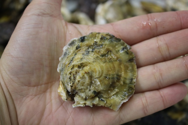 手のひらにのせるとこんな感じのサイズ感のカキです。