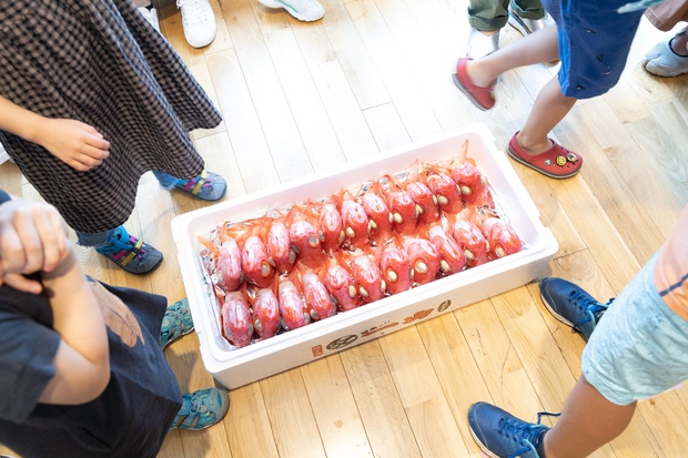 飾っておいた本物のキンメダイを触りに来る子供達。
