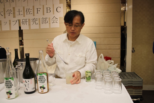 高知大学土佐FBCシロップ研究部会 塩田貴志さんによる、酢みかんを使ったオリジナルカクテルの説明