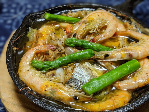 カスエラと呼ばれる(耐熱の陶器)にて、熱したオリーブオイルごと供されます。