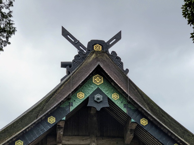 神社建築にはめずらしく正面破風の装飾にステンドグラスが使われています。