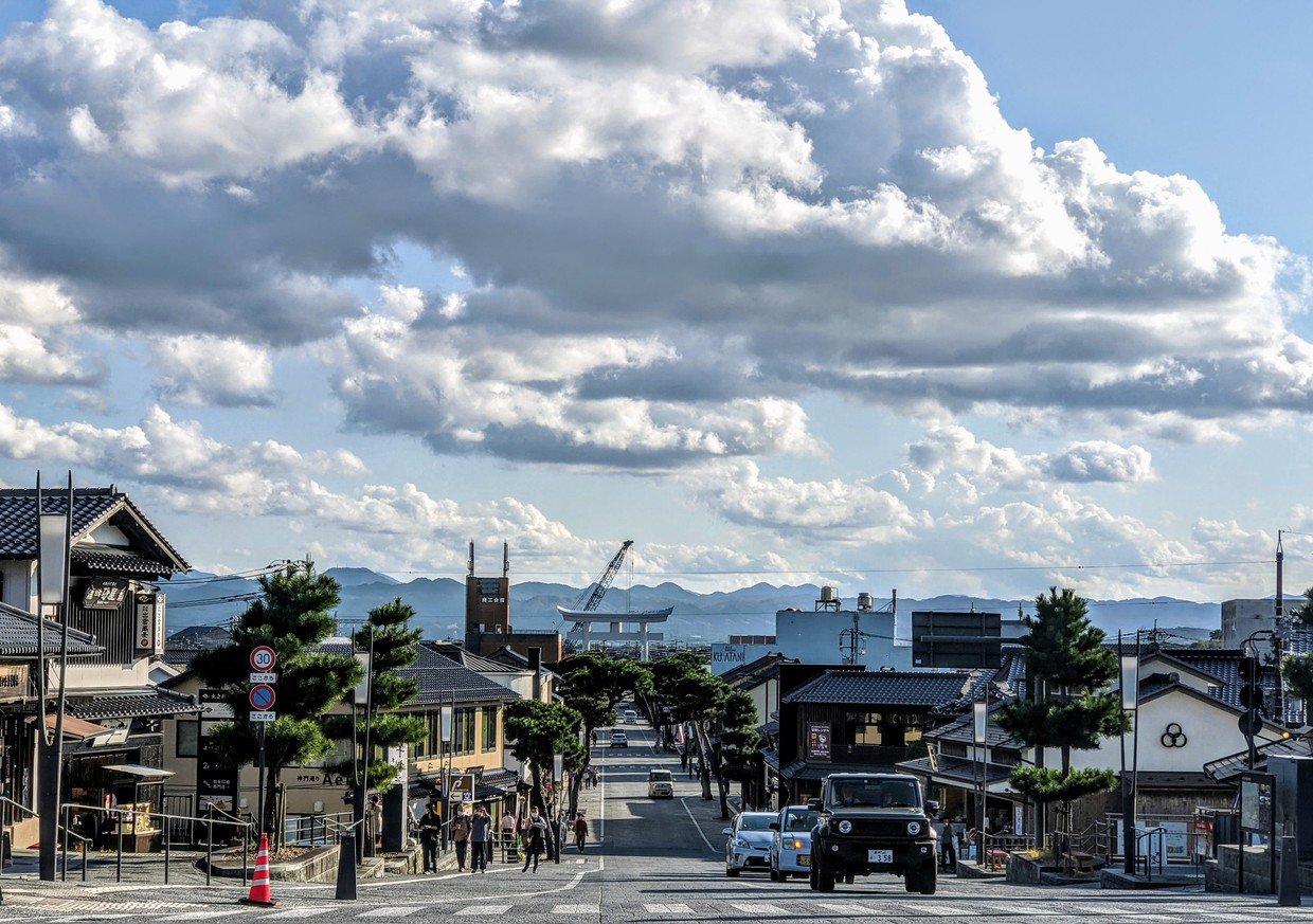 神門通りのずっと先に見える白い鳥居が【一の鳥居】である宇迦橋の大鳥居です。
