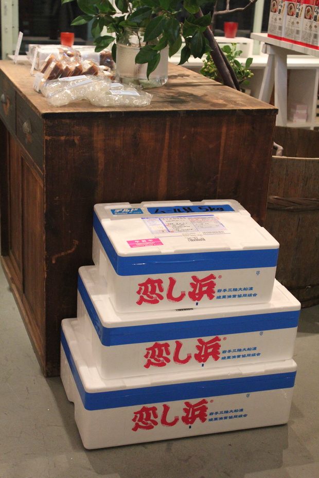 酢飯屋店内に積まれる『恋し浜ホタテ』と『ムール貝』