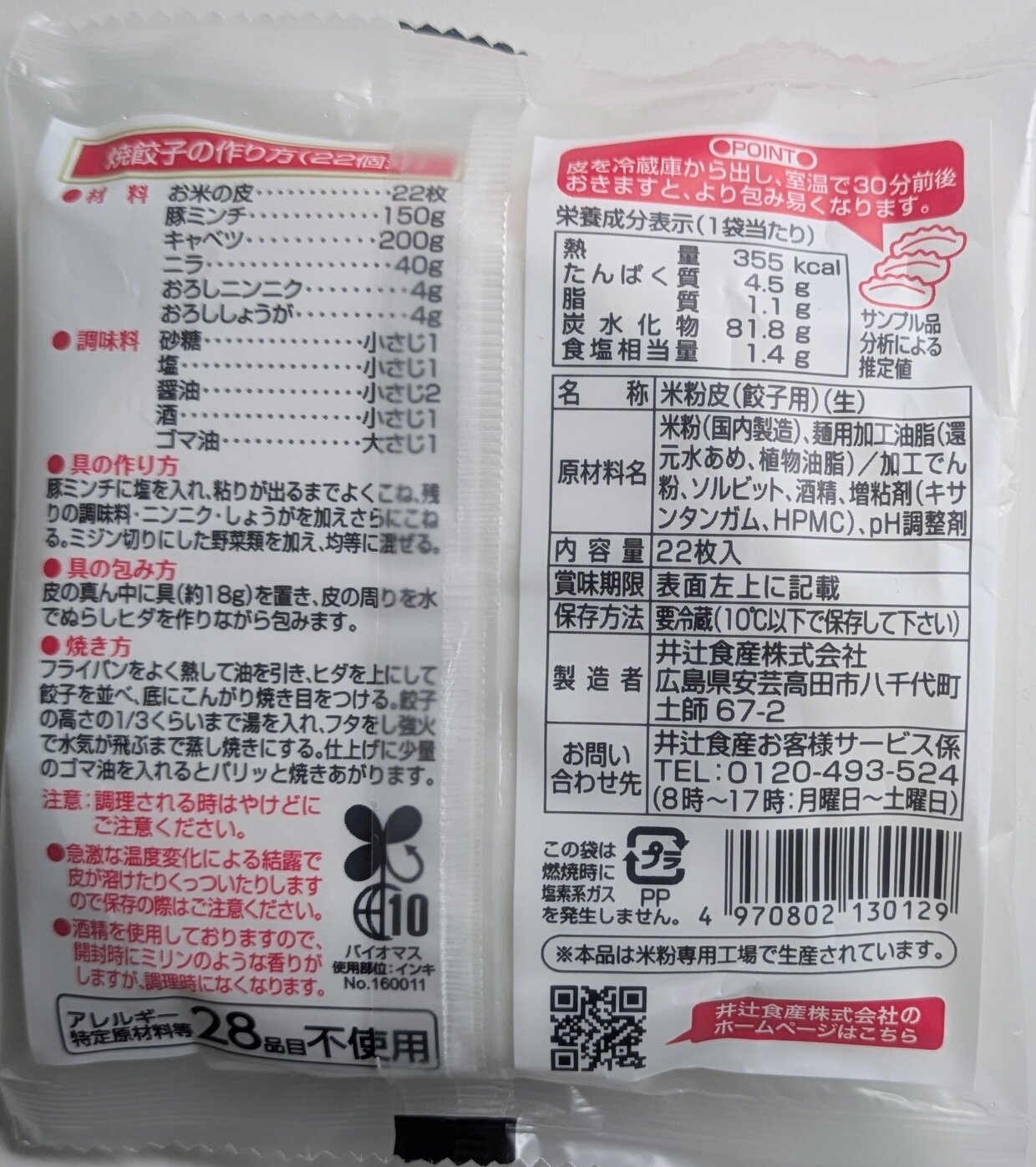 名称:米粉皮(餃子用)(生) 原材料名: 米粉(国内製造) 麺用加工油脂(還元水あめ、植物油脂) 加工でん粉 ソルビット 酒精 増粘剤(キサンタンガム、HPMC) pH調整材