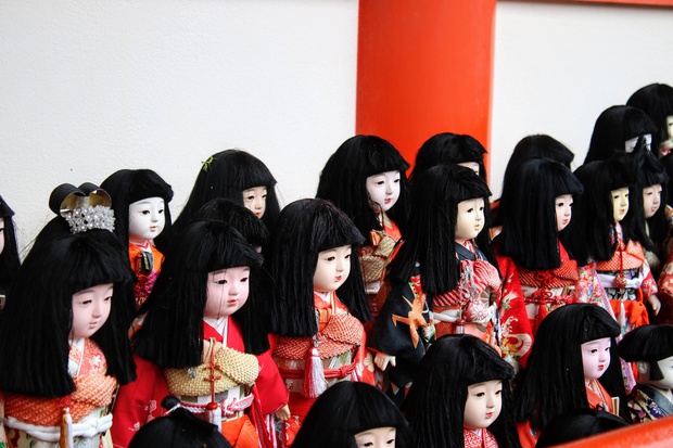 本殿にお人形さんが沢山、きれいに並べ飾られています。