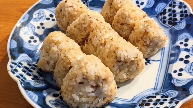 サワラの炙り握り寿司に醤油漬けしたにんにくを刻みのせたもの