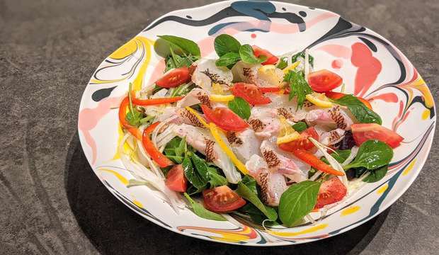後日、マーブル皿にカルパッチョを盛り付けてみると、