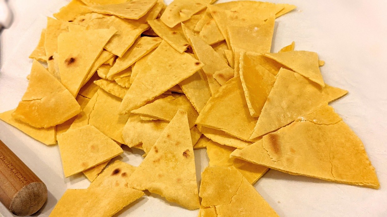 手早く揚げたトルティーヤに細切りしたチェダーチーズを加えて軽く加熱し、