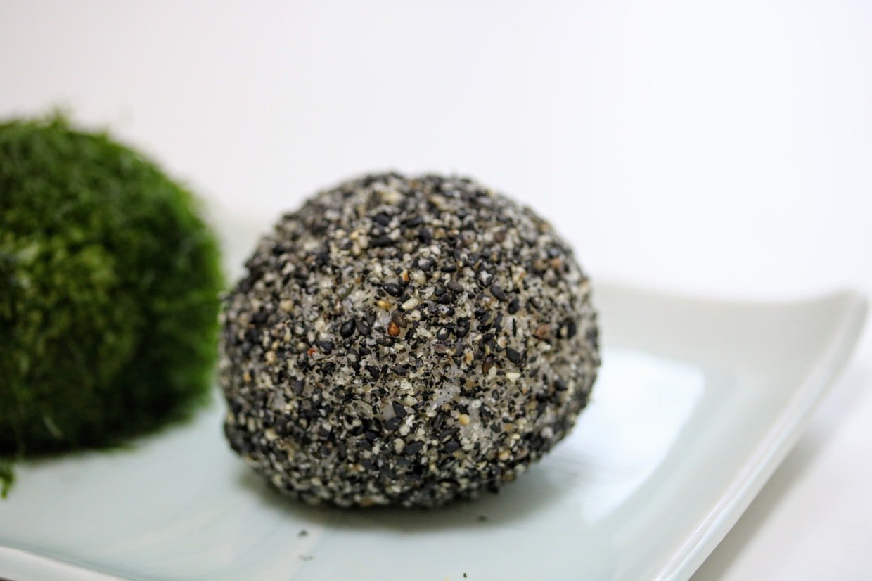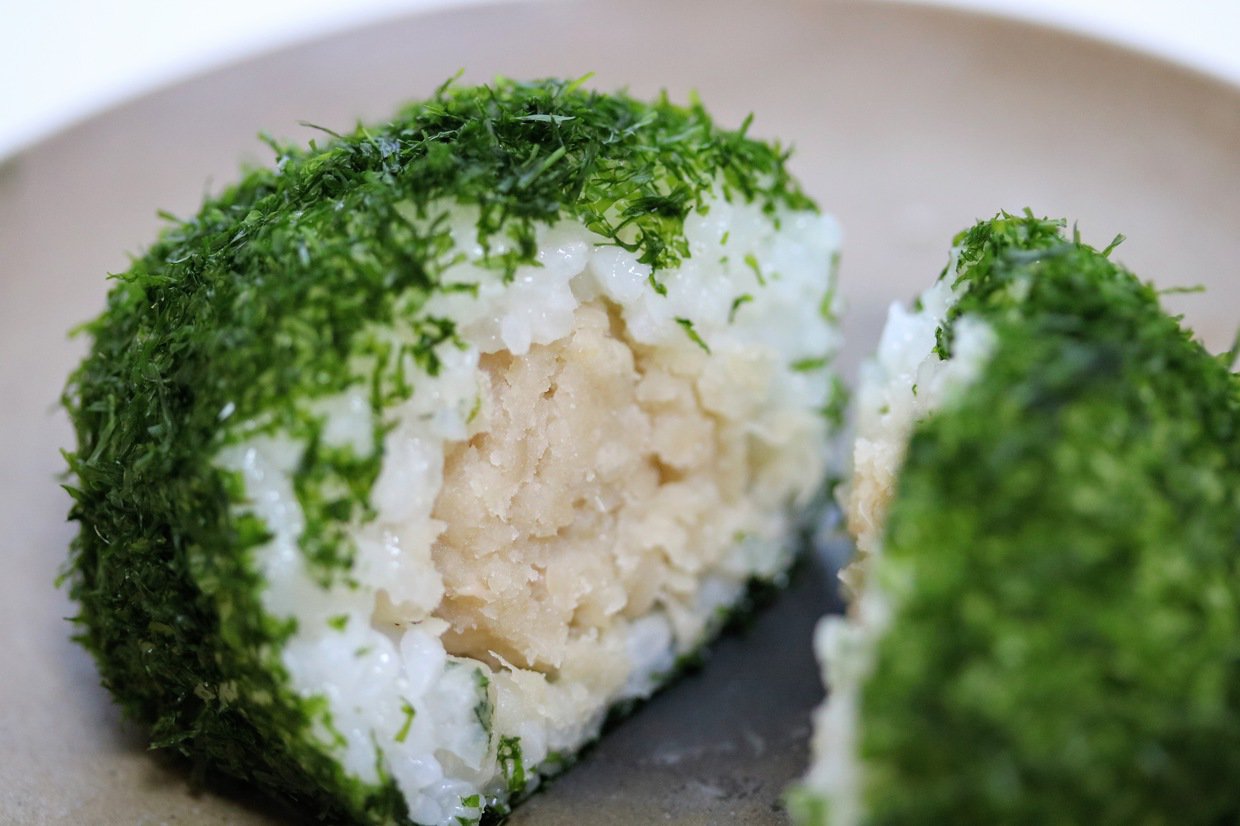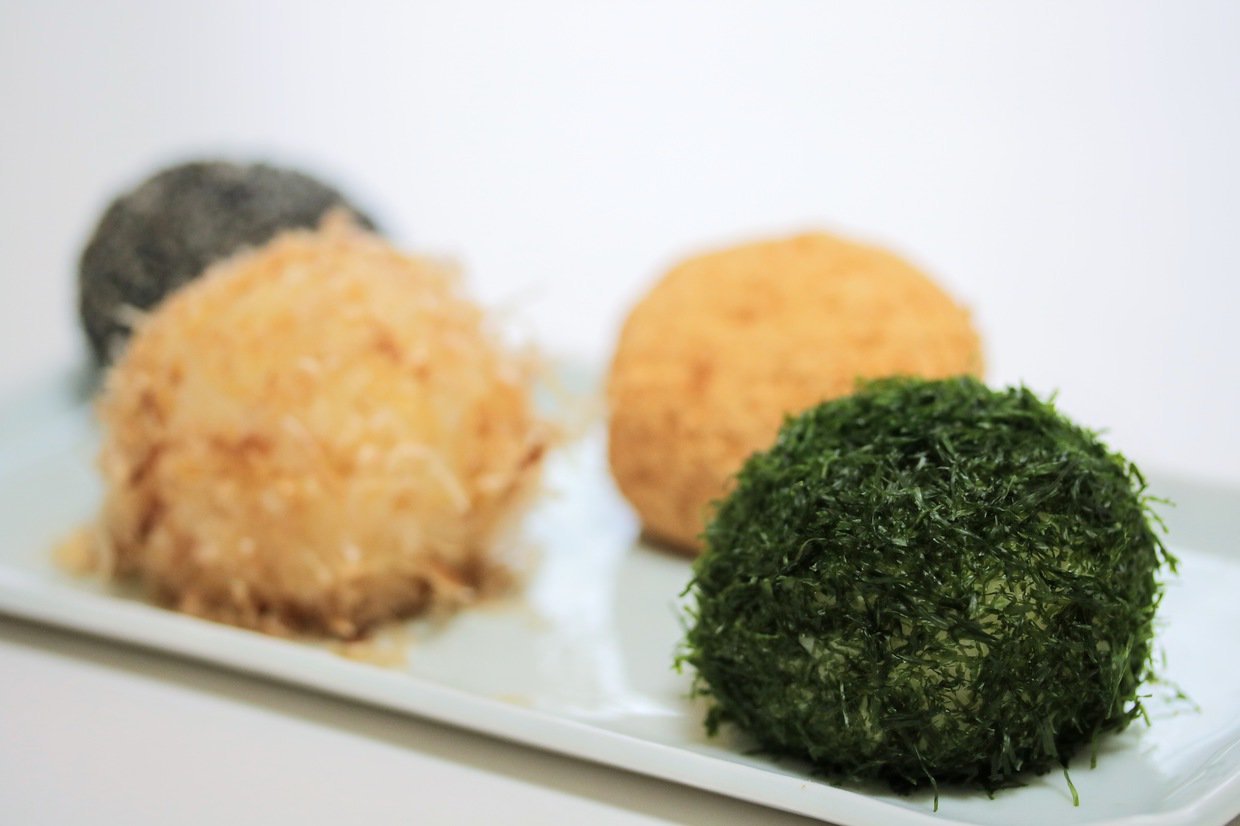 左:きなこのおはぎ 中:すじあおのりのおはぎ 右:黒ごまのおはぎ