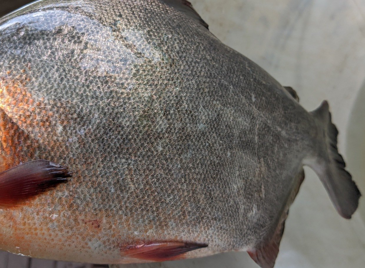体は楕円形に近く、銀色の斑点がついている細かい鱗で覆われています。