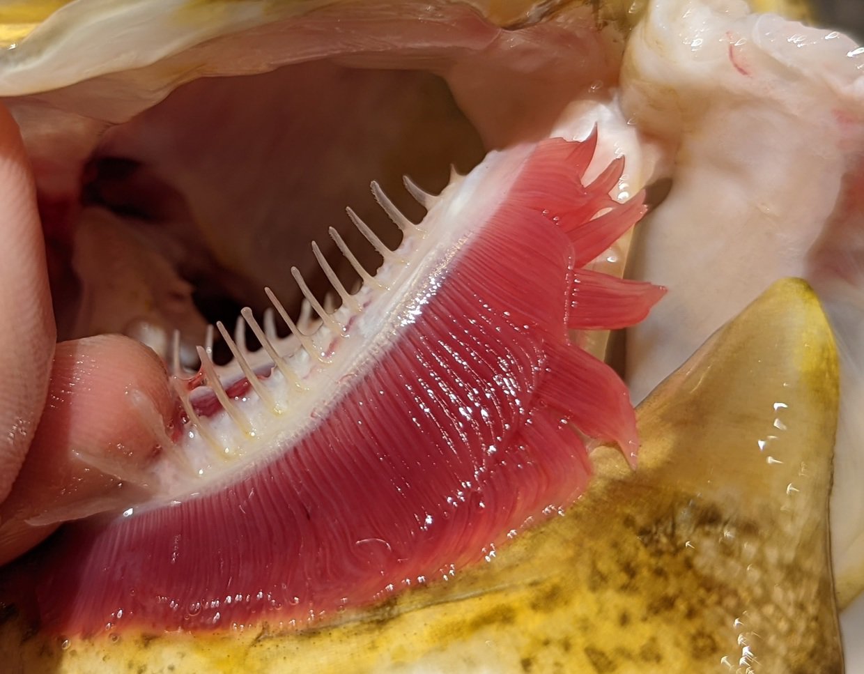 鰓弓(さいきゅう)の上についている白いトゲトゲしたものが鰓耙(さいは)です。