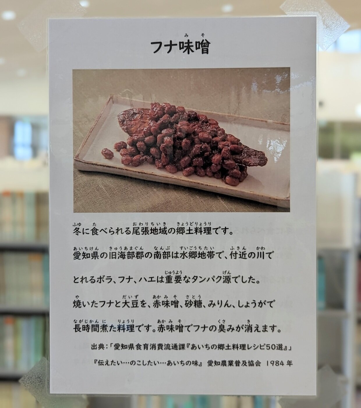焼いたフナと大豆を、赤味噌、砂糖、みりん、生姜で長時間煮た料理です。