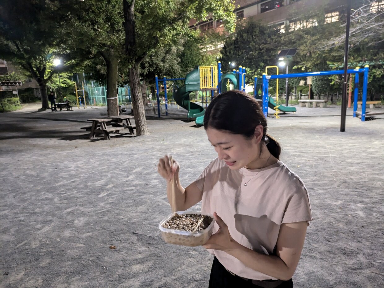 夜の月島児童公園でもんじゃの前に納豆を食べる