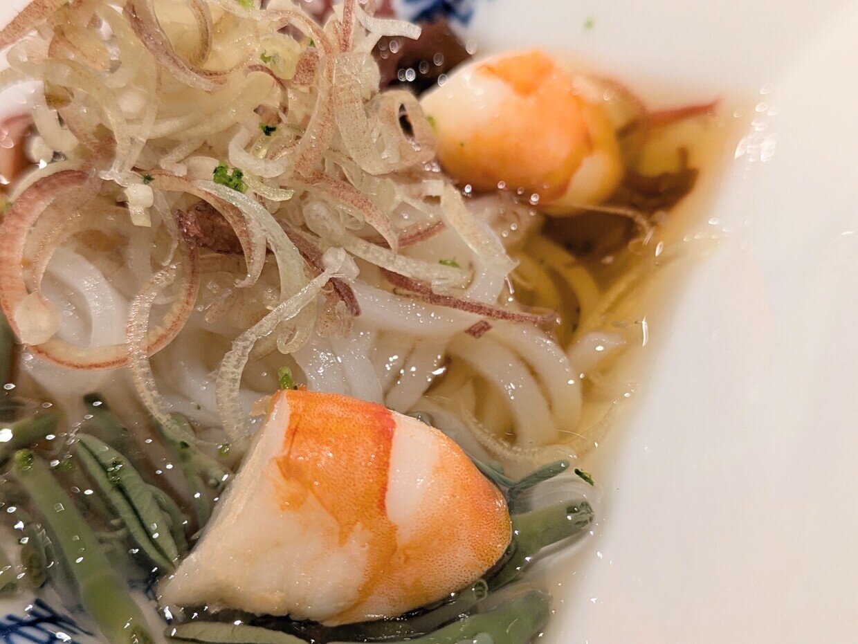 能登産米粉麺 いしり出汁 若ひじきの梅肉和え 九条ネギ