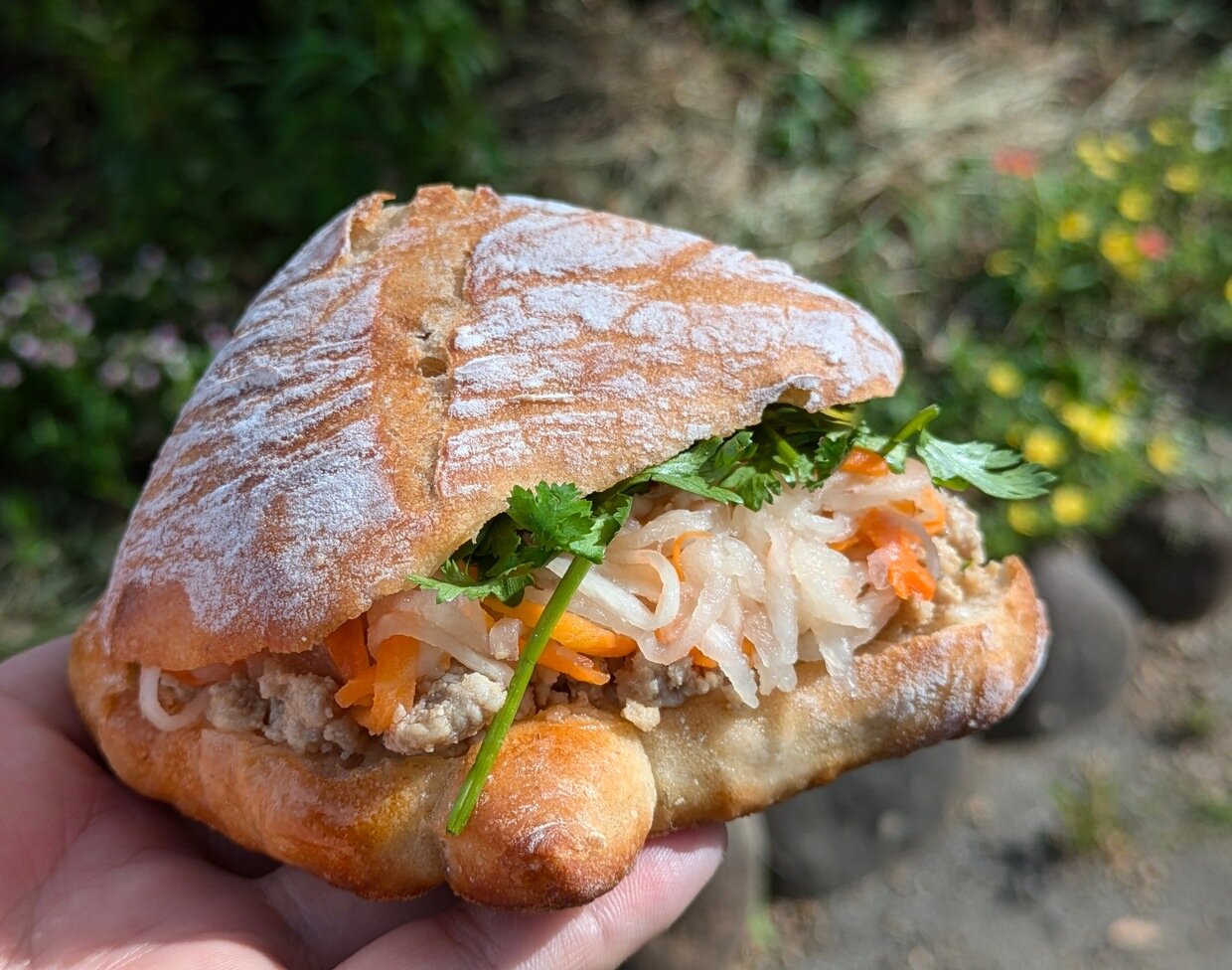 自家製なます&ガーリックマヨとタイ風ひき肉炒めがサンドされています。
