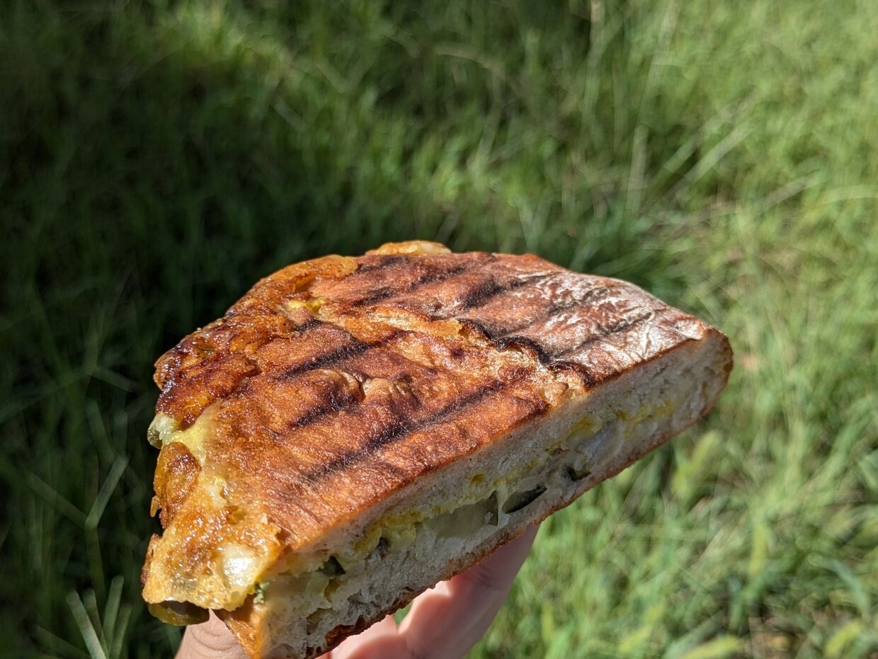 手作りのキュウリのぬか漬けとチーズが入ったホットサンドです。
