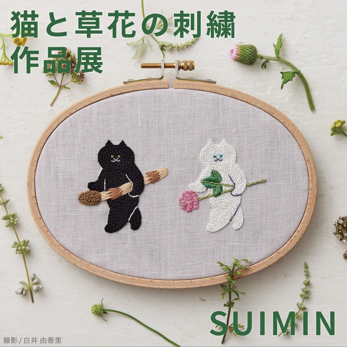 猫と草花の刺繍をテーマにした作品約30点の展示と、グッズ販売を予定しています。