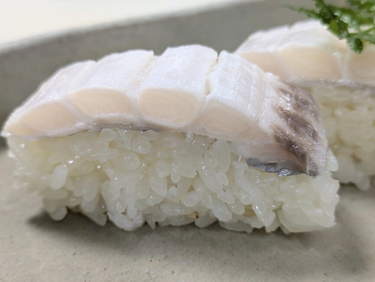 タチウオの銀色の皮を内側にして隠したようなすしが『かいさまずし』です。