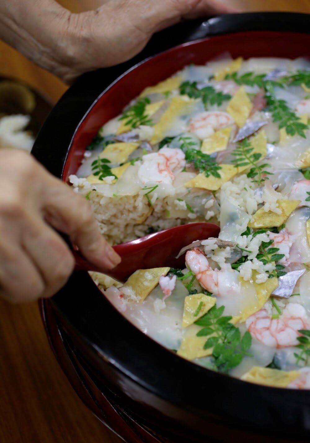 帰り際に、万喜子さんが僕に酒ずし専用の琉球塗りの桶をプレゼントしてくださいました。