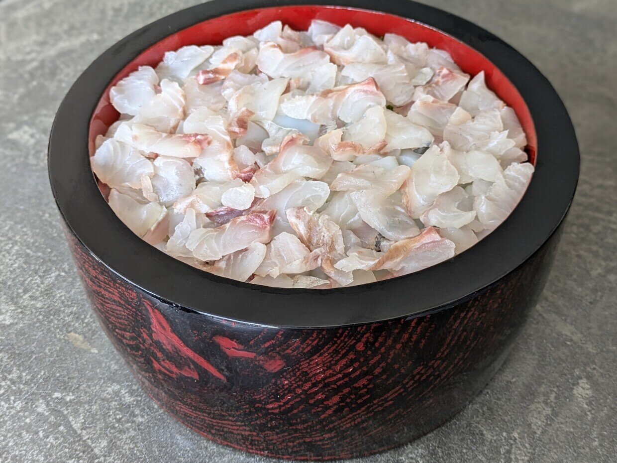 酒ずしは色合いも大切にするので、光り物の魚で銀色も散りばめたい。