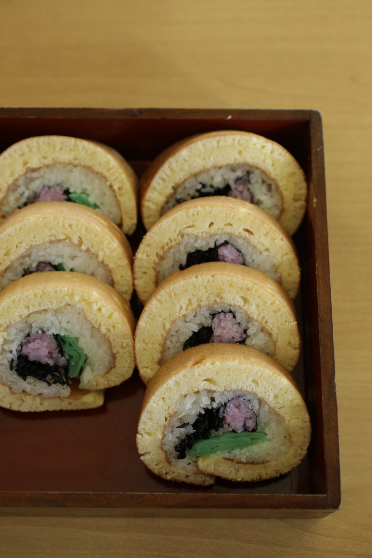 食べてみると、ロールケーキよりはパンケーキのような食感、そしてすぐにモチモチの酢飯が登場。