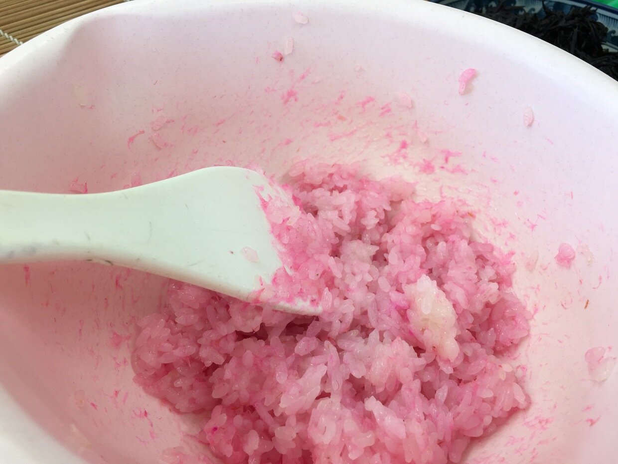 伊達巻きを焼いている間に、桜でんぶと酢飯を混ぜ合わせたものを少しだけ用意します。