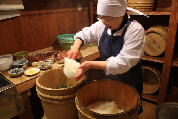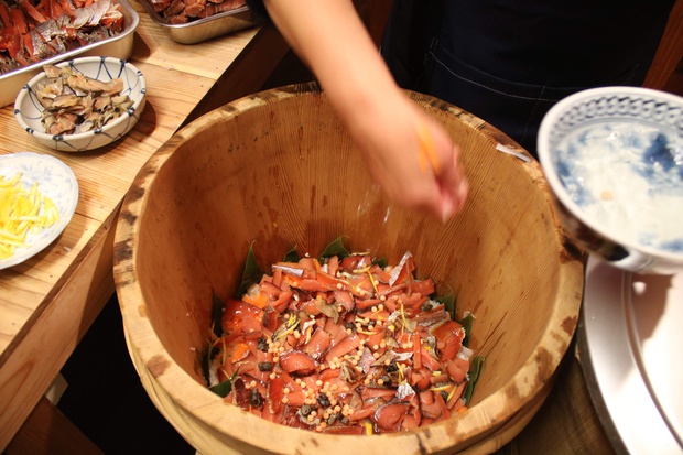 糀とご飯を床にして氷頭、塩引鮭の様々な部位の切身やはらこ、大根、にんじん、ゆず等をのせ、木桶の中で1ヶ月間発酵させて造るなれずしのひとつです。