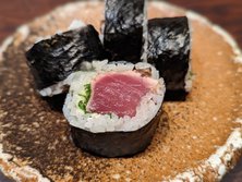 高知県の郷土寿司です。 藁焼きされた肉厚のカツオや生のネギ、大葉やニンニクと一緒に中巻きサイズに巻かれた 注文必須のお...