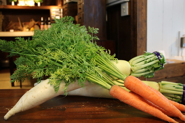 大愛さんの椎茸とみふね畜産の健康豚の鍋 藤田さんの大根の皮仕上げ