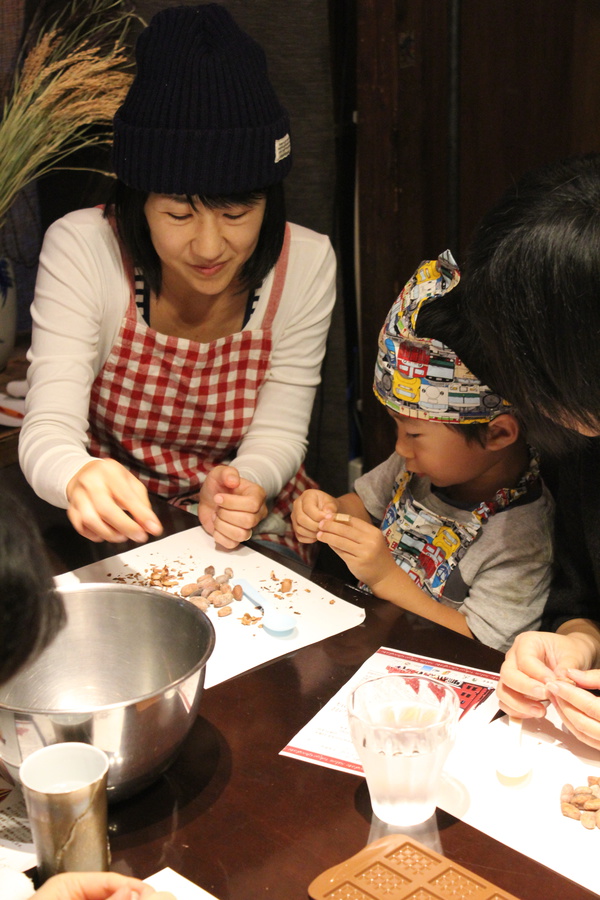 カカオ豆の殻を剥くところからチョコレート作り体験出来るのが