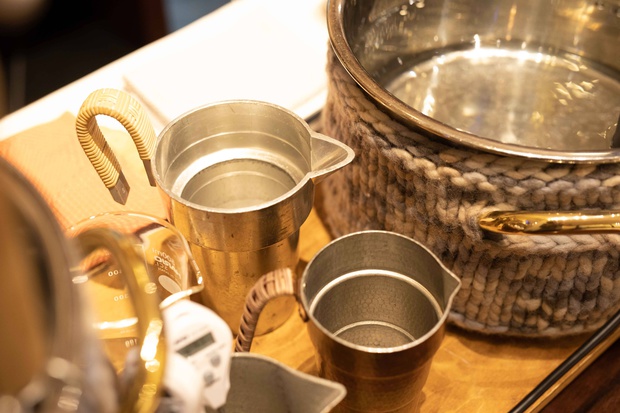 銅のチロリで60℃まで温め平杯でどうぞ。